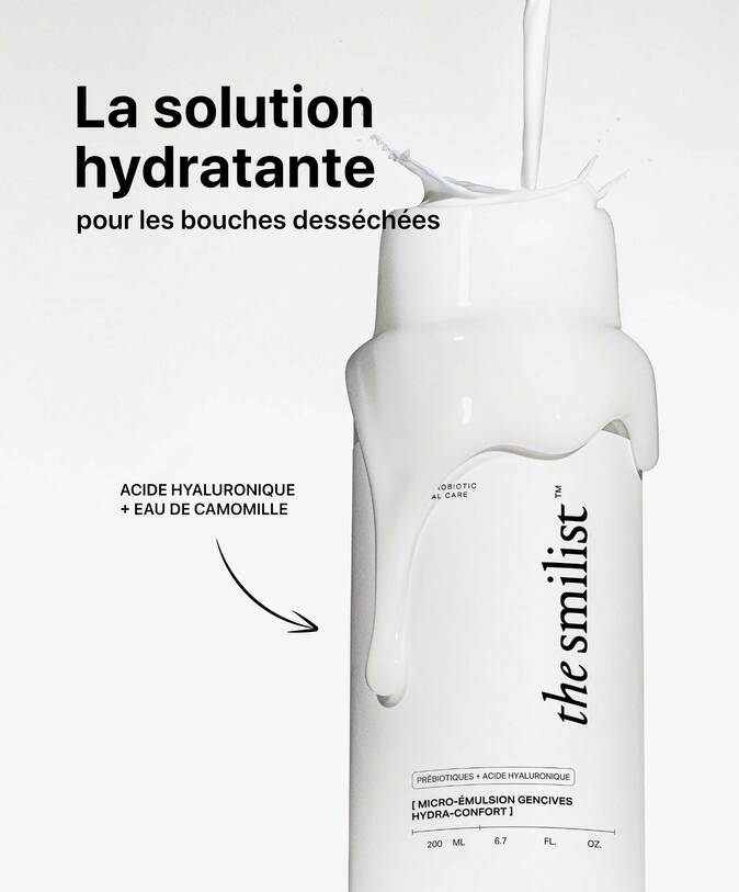 Un soin à la texture lactée rafraîchissante, enrichie en acide hyaluronique et en hydrolat de camomille, qui hydrate, apaise et réconforte les gencives. Idéale en cas de sécheresse ou de sensation de bouche pâteuse. S’utilise comme un bain de bouche.